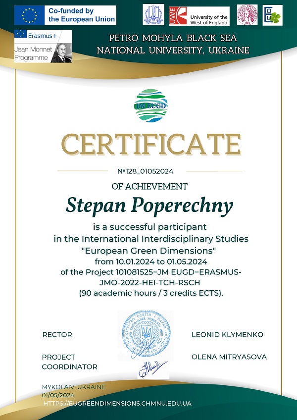 Протягом першого півріччя 2024 року науково-педагогічні працівники факультету економіки та менеджменту Степан Поперечний (кафедра маркетингу), Дмитро Соломонко і Оксана Саламін (кафедра економіки підприємства, інновацій та дорадництва в АПК імені І. В. Поповича) пройшли навчання в Міжнародних Міждисциплінарних Студіях “Європейські Зелені Виміри” проєкту Програми ЄС Еразмус + Жана Моне.