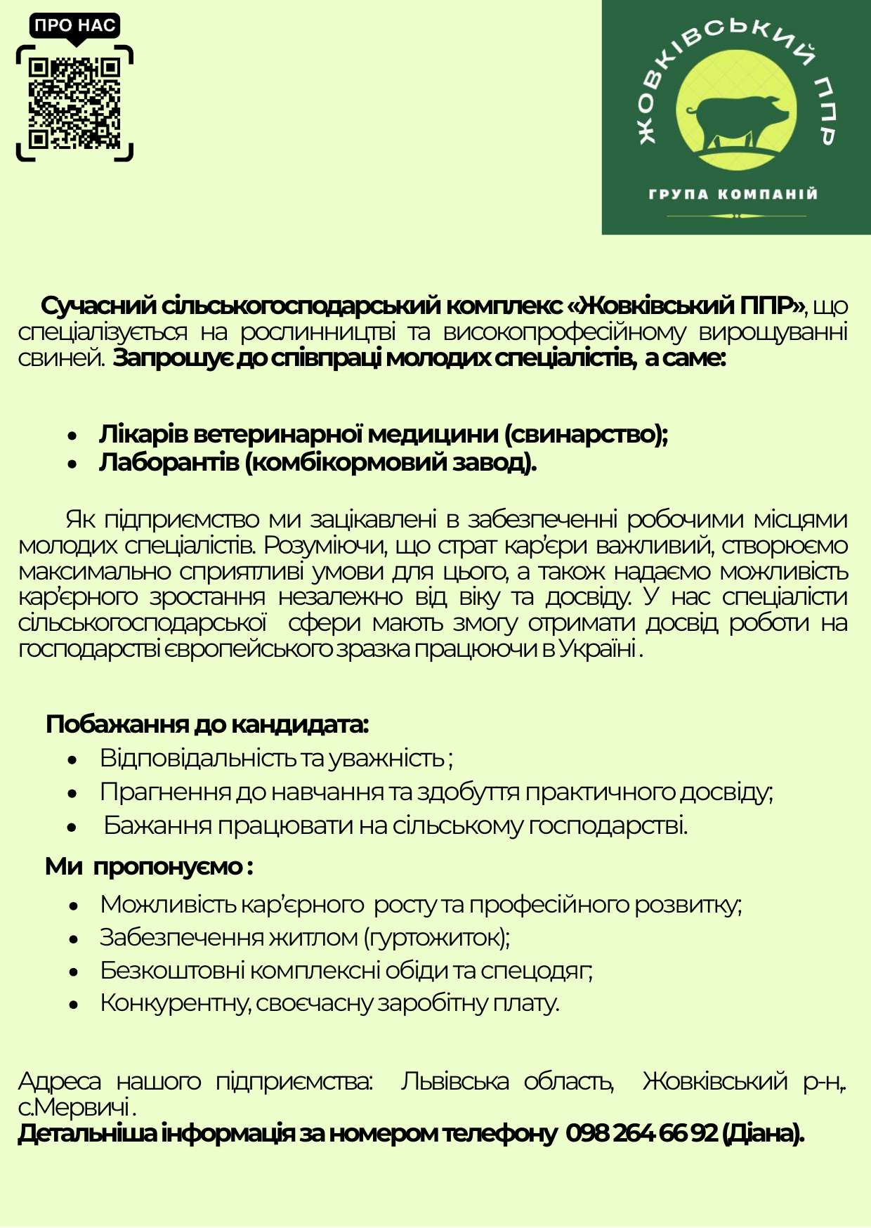Вакансія від 29.09.2023 Пропозиція від ТОВ Жовківський ППР" для лікарів ветеринарної медицини і технологів у тваринництві
